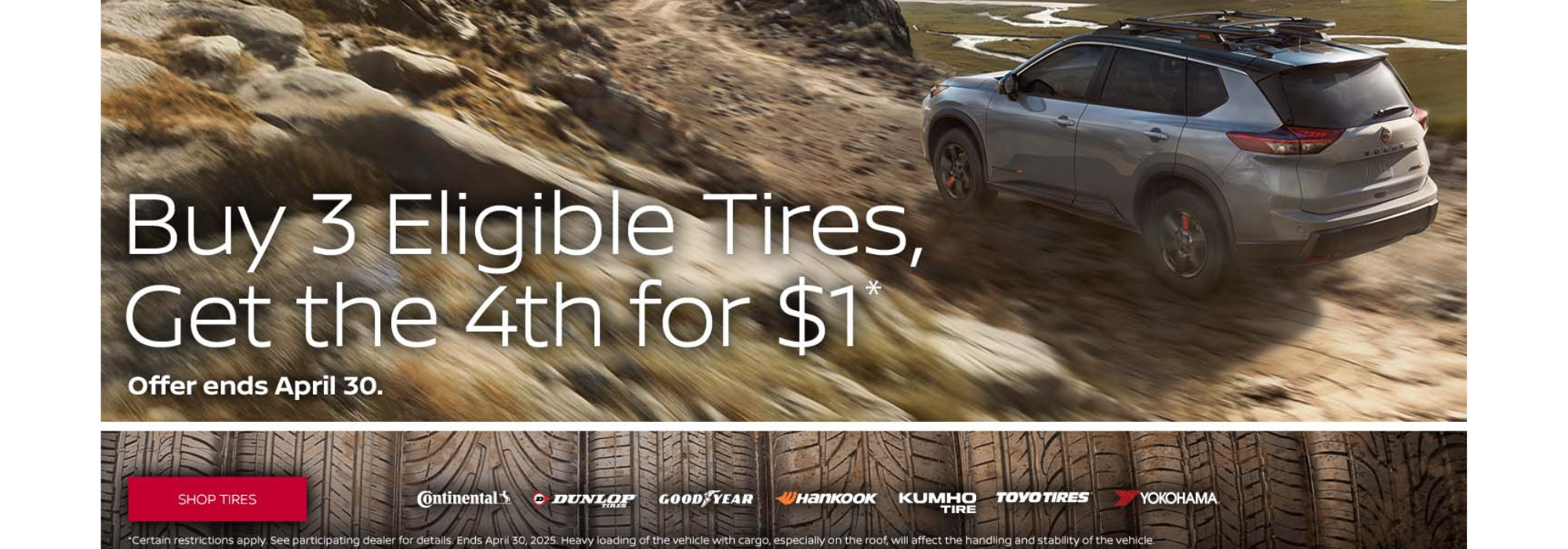 *Offer available for a limited time. Eligible on select OEM, OEA, and WIN tires only when purchased from and installed by a participating Nissan dealer. Other restrictions apply. See dealer for details. Price and offer availability may vary by model. Taxes and fees additional. No cash value. May not be combined with any other offers. Void where prohibited. Offer ends April 30, 2025.